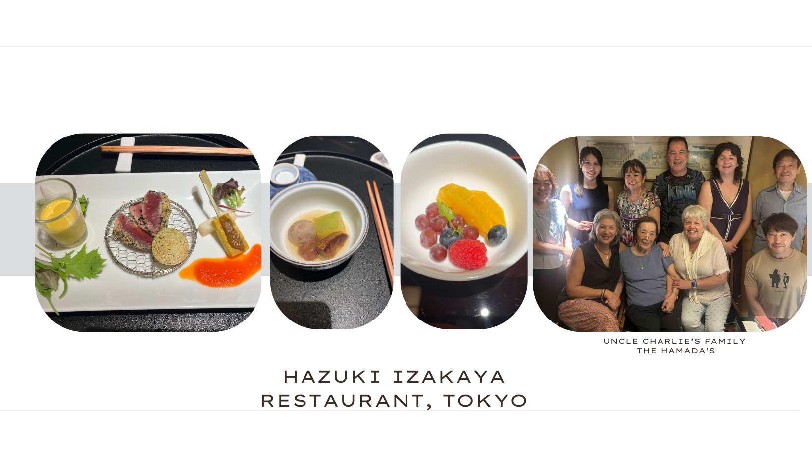 We were so delighted to be invited by Uncle Charlie’s family (you might remember him from Alli’s book At the Foot of the Cherry Tree) to join them for dinner at Hazuki Izakaya in Nishishinbashi. What followed was an evening that felt like both a reunion and a celebration — a catch-up more than 30 years overdue.