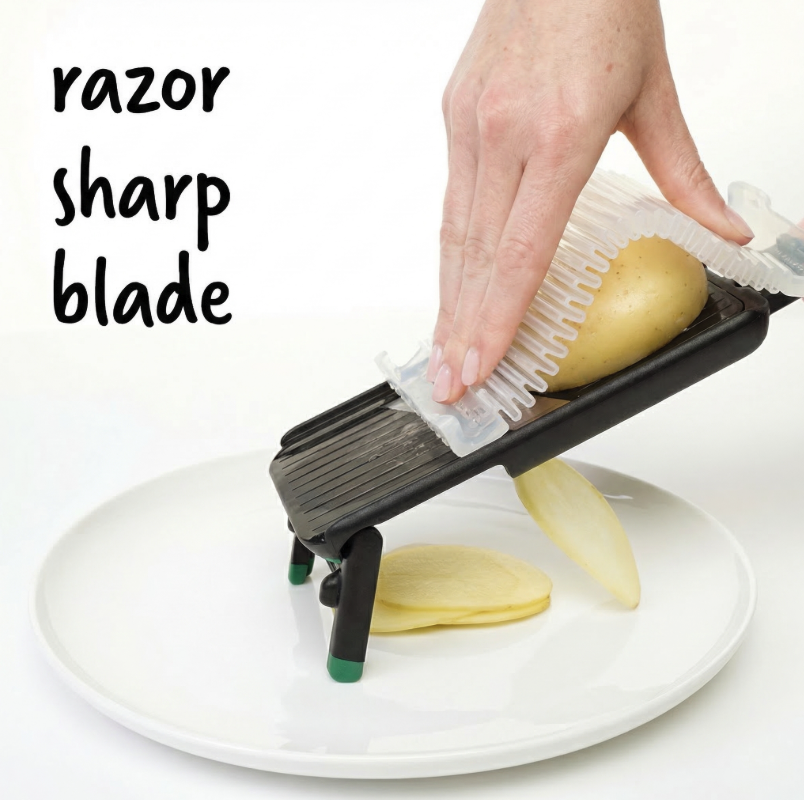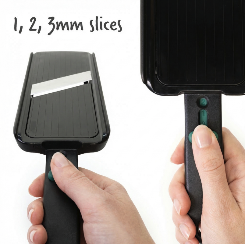 The razor-sharp Japanese stainless steel blade delivers clean, even slices and offers three thickness settings — 1mm, 2mm and 3mm — making it ideal for everything from fine cucumber and onion to slightly thicker potato, zucchini or apple slices. When you are finished, the blade locks closed for safe storage, which is another thoughtful detail that makes this tool feel practical rather than risky.